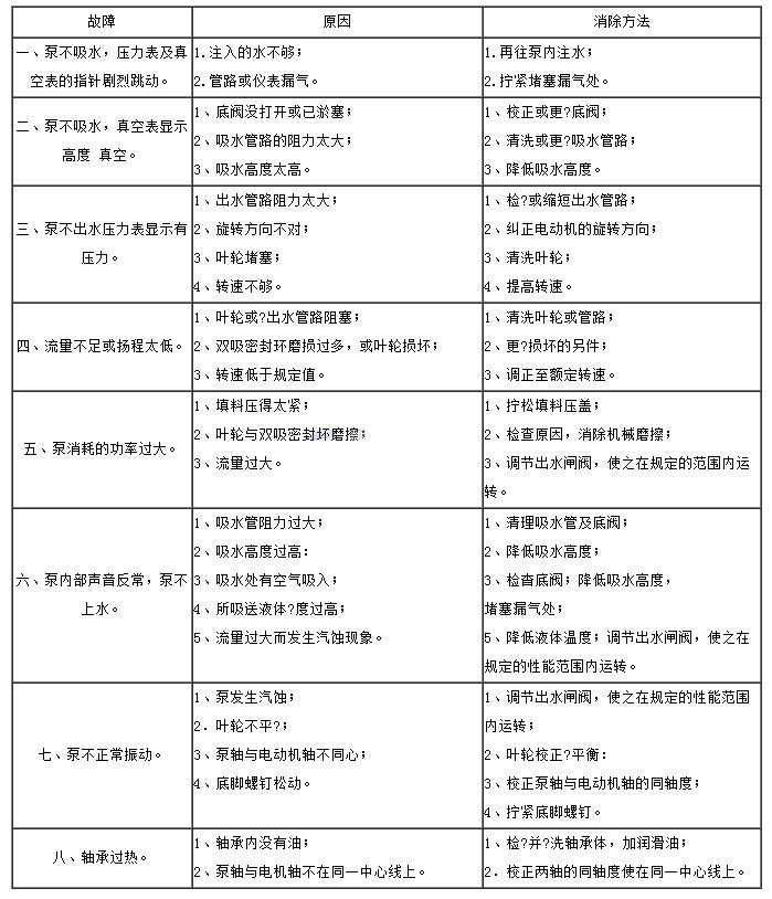 起動(dòng)前,轉(zhuǎn)動(dòng)泵的轉(zhuǎn)子,應(yīng)該輕滑均。 ② 關(guān)閉出水閘閥,向泵內(nèi)注不(如無(wú)底閥則用真空泵抽空引水)要保證泵內(nèi)充滿水.無(wú)空氣窩存。 ③ 如果泵上裝有真空表或壓力表.要關(guān)閉其與泵相連接的旋基再起動(dòng)電動(dòng)機(jī).待轉(zhuǎn)速正常后再打開;然后逐漸打開出水閘閥,如流置過大,可以適當(dāng)?shù)仃P(guān)小閘閥進(jìn)行調(diào)節(jié);反之流量過小時(shí).將閘閥開大。 ④ 均?地?cái)Q緊填料壓蓋上的壓緊螺母,使液體成滴狀漏出.同時(shí)注意填料腔處的?升。 ⑤ 當(dāng)停止水泵運(yùn)轉(zhuǎn)時(shí).要先關(guān)閉真空表及壓力表的旋塞和出水管路上的閘閥.然后關(guān)閉電動(dòng)機(jī)的電源.如 所處環(huán)境的溫度較低時(shí),則應(yīng)將泵體下部的四方螺塞打開.去掉??水.以免凍裂。⑥長(zhǎng)期停止使用時(shí).應(yīng)拆開水泵將另件上的水擦干.在加工表面涂上防銹油保管好。